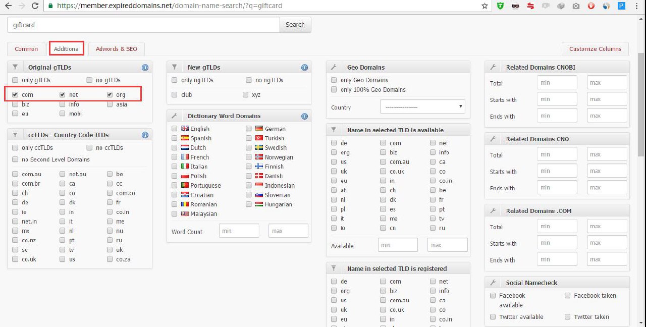 我就只选com net org,注意你不用跟我选的都一模一样,我只是演示一下,一般用的过滤条件越多,选出来的域名有可能更好。 然后应用这些选择看一下