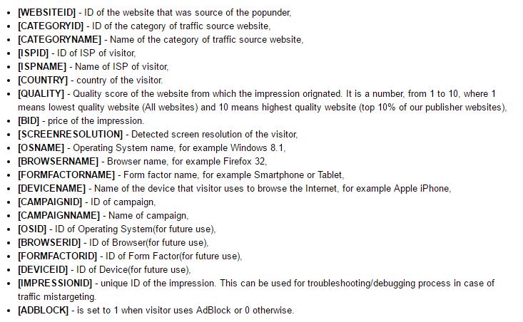 像example里那样,比如我们需要传设备名称给联盟,那我们的offer link就变为: http://cake.com/?a=12345&c=67890&s1=popads&s2=[[subid]]&subid2=[[c8]]