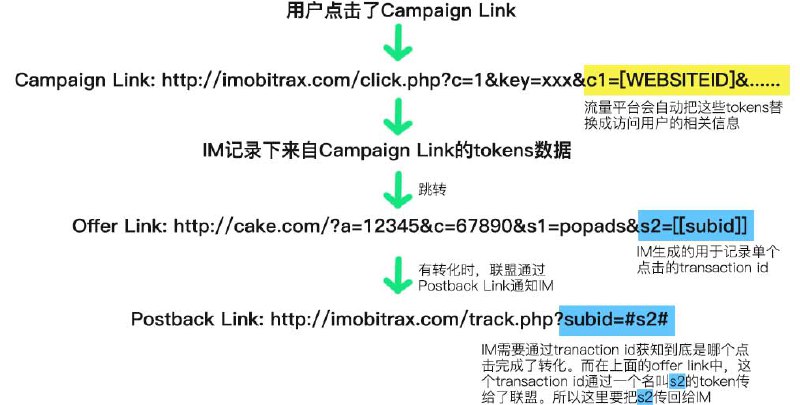 http://imobitrax.com/click.php?c=1&key=xxx&c1=[WEBSITEID]&c2=[CATEGORYNAME]&c3=[ISPNAME]&c4=[COUNTRY]&c5=[BID]&c6=[OSNAME]&c7=[BROWSERNAME]&c8=[DEVICENAME]&c9=[ADBLOCK]再看广告联盟程序Cake Marketing里的affiliate link: http://cake.com/?a=12345&c=67890&s1= 由于cake的s1(一般用于追踪流量源)无法追踪过多不同数据,所以我们要再多加一个subid用于追踪transaction id(追踪程序生成的随机数列),通过查询tokens得知cake用s1-s5作为subid